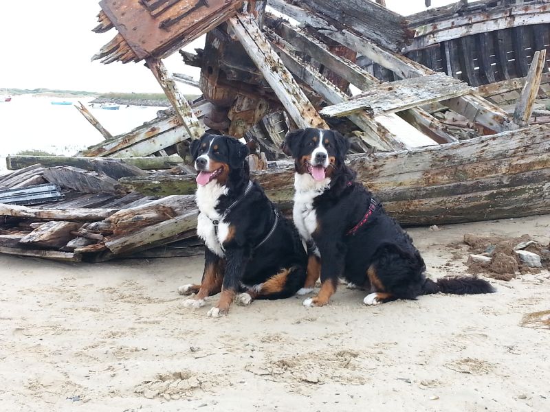 Frida und Femke vor einem Wrack im Hafen von Portbail, Juli 2015