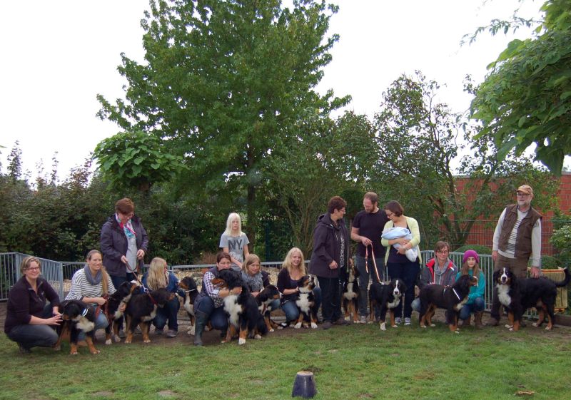 Welpentreffen 2015, 9 Welpen des G- Wurfes mit Mutter Femke und Vater Gysmo (Gustaf war vor dem Foto schon abgereist)